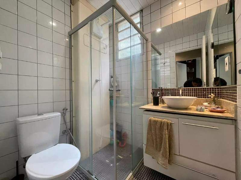 Banheiro social com bancada em granito, pia em cuba de apoio, armários planejados e box em blindex