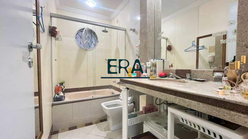 Banheiro social com forro rebaixado em gesso, bancada em granito, espelho, box em blindex e banheira