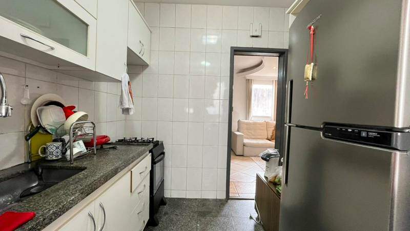 Cozinha funcional com armários planejados e piso em granito.