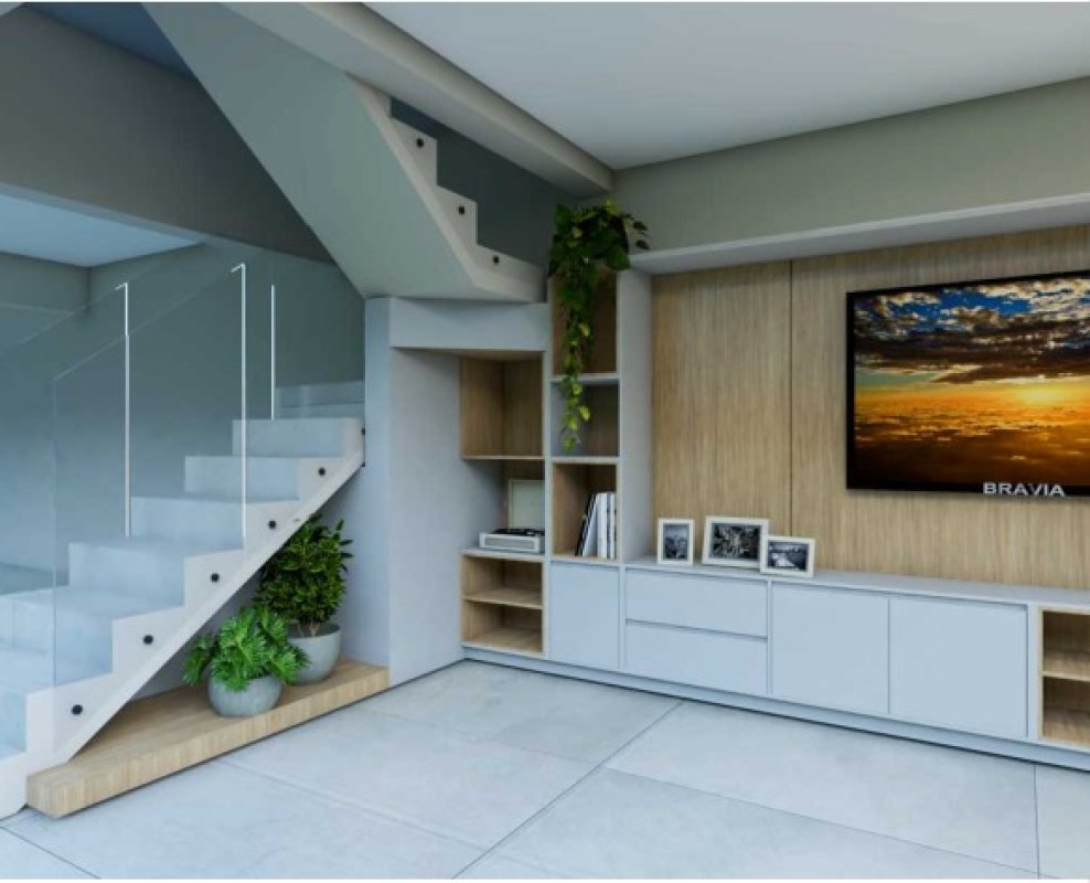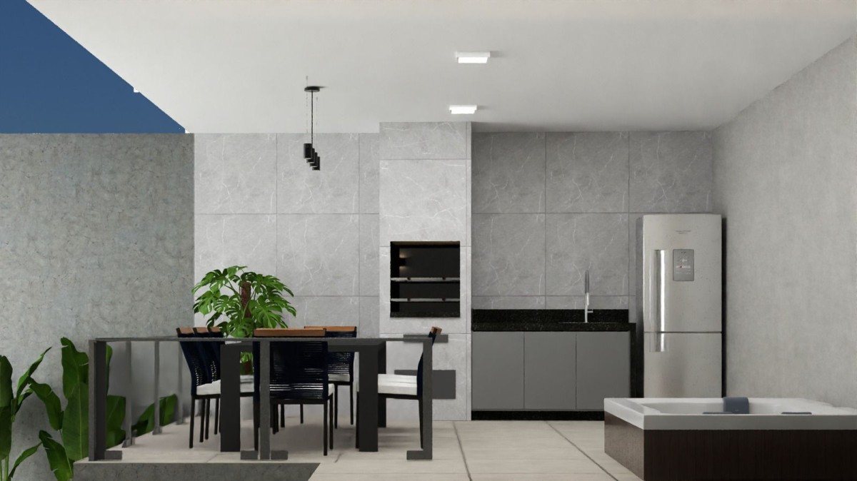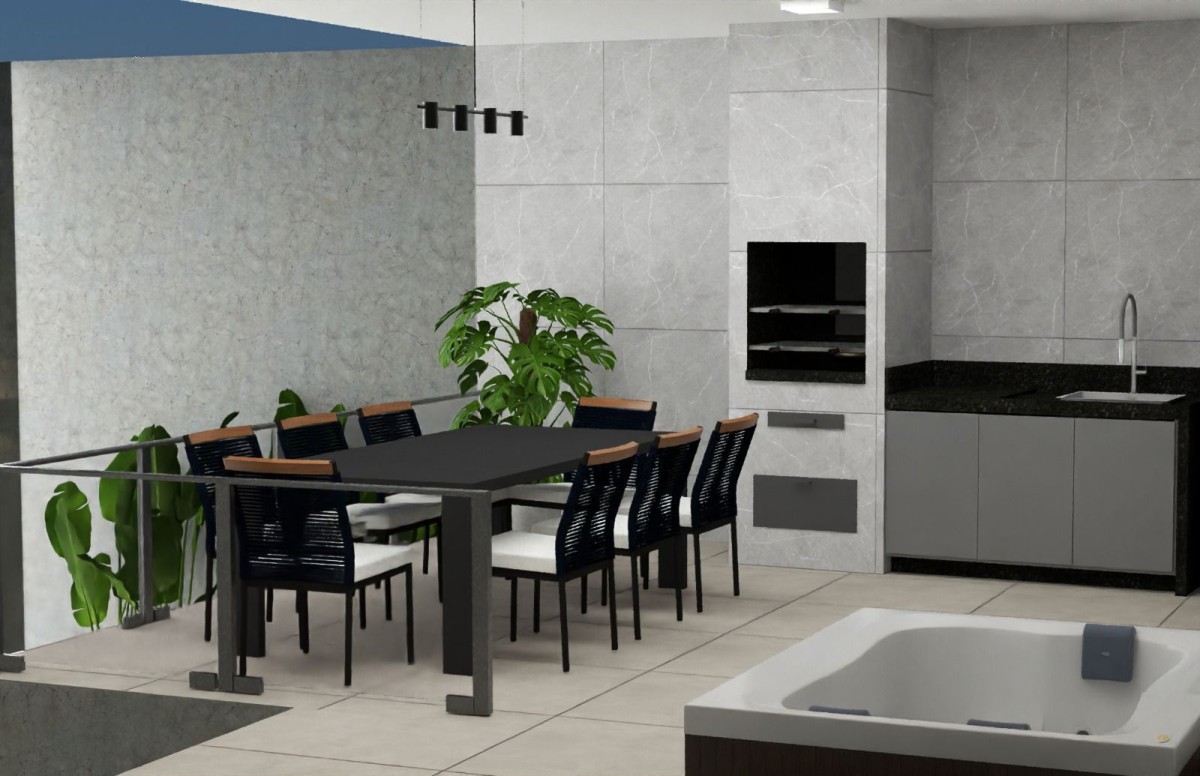 1° Pavimento: Sala ambiente aberto com a cozinha, lavabo, área livre de terreno com espaço para área gourmet com pré-disposição para churrasqueira.